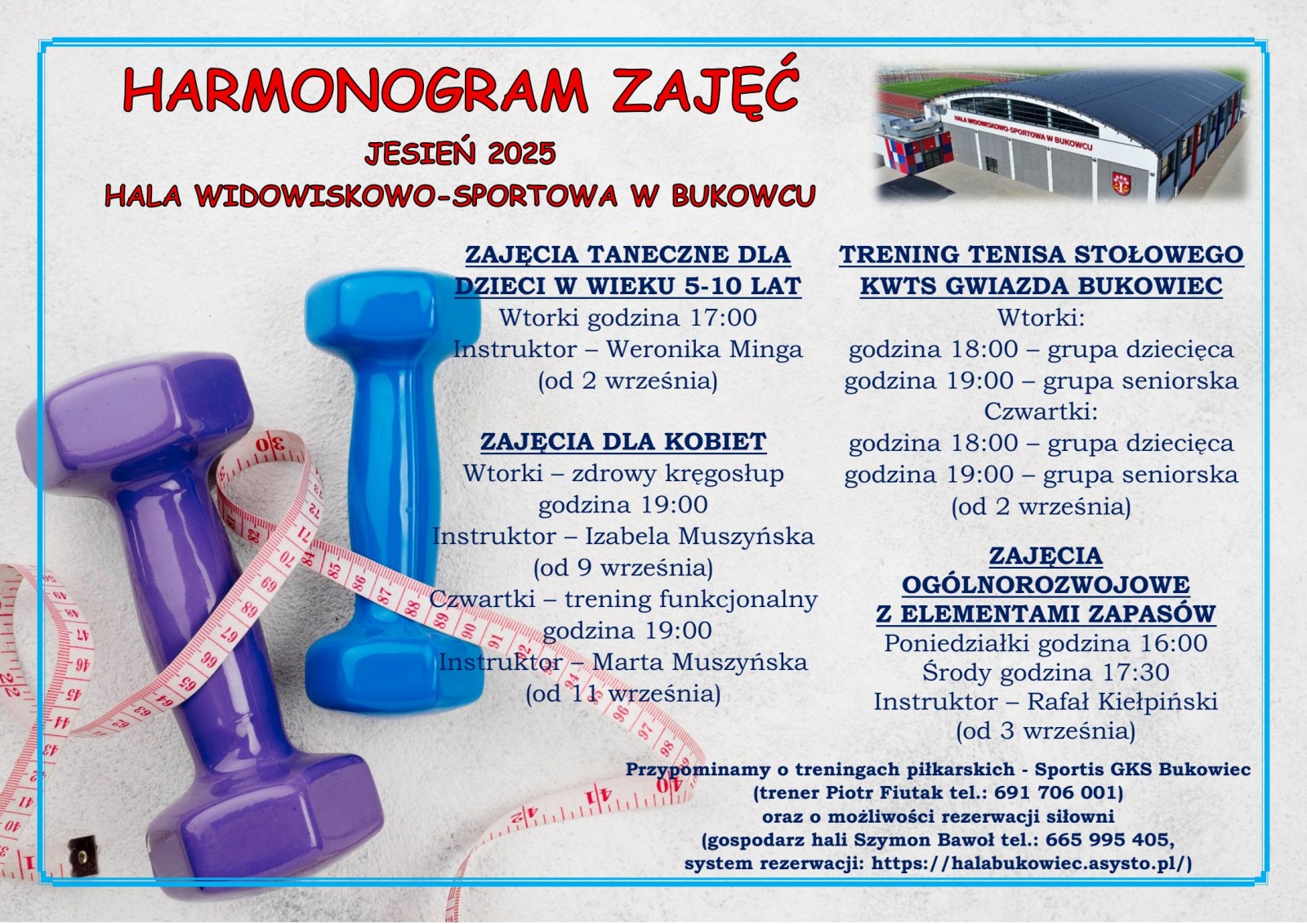 Otwarte zajęcia i możliwość rezerwacji hali popołudniami. W trakcie roku szkolnego, w godzinach zajęć lekcyjnych, obiekt służy uczniom Szkoły Podstawowej w Bukowcu na zajęcia wychowania fizycznego.